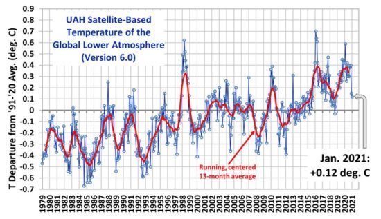 The global average lower tropospheric temperature (LT) anomaly of version 6.0 for January 2021 was +0.12 degrees. C, slightly lower than in December 2020 of +0.15 degrees. C. NOTE: We changed the 30-year average period from which we calculate anomalies from 1991 to 2010 to 1991-2020. This change does not affect temperature trends.