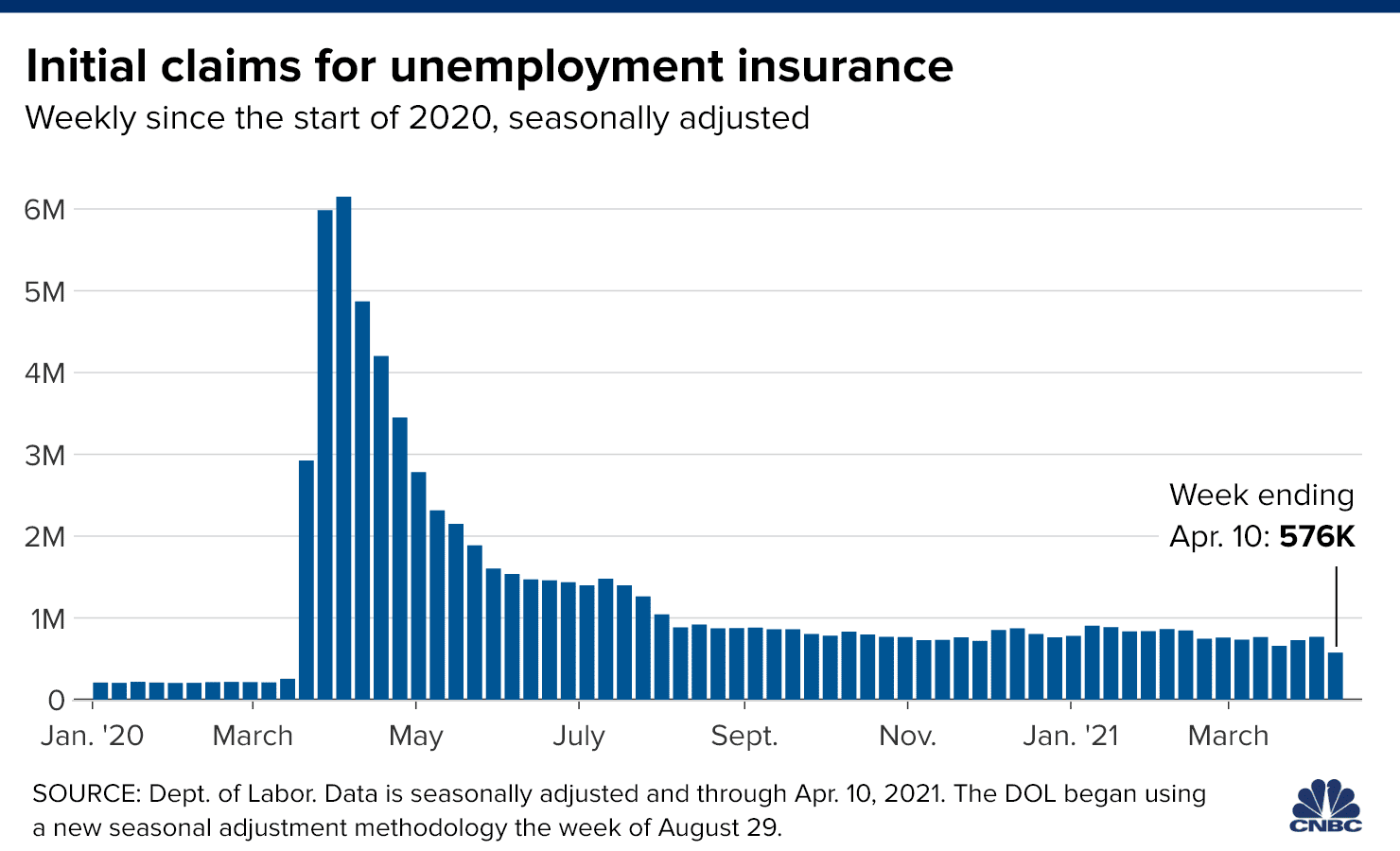 The Department of Labor reported 547,000 new unemployment benefits claims last week on Thursday, lower than expected and a new low in the Covid pandemic. The previous week’s initial unemployment claims were revised up to 586,000. However, these are the first readings below 600,000 since the 256,000 reported for the week ending March 14, 2020.