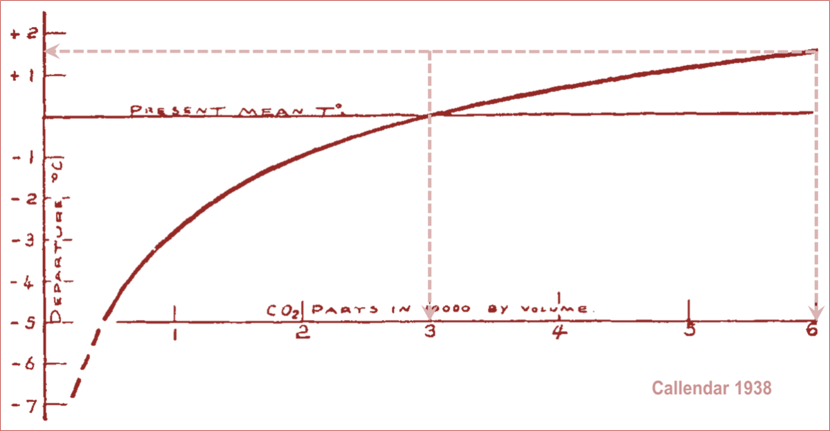 Guy Stewart Callendar, a British steam engineer, published his own calculation in 1938, and presented his result before the Royal Society (the Society’s subsequent discussion is well worth reading). He, too, predicted 1.6 C° ECS, as the dotted lines I have added to his graph demonstrate: