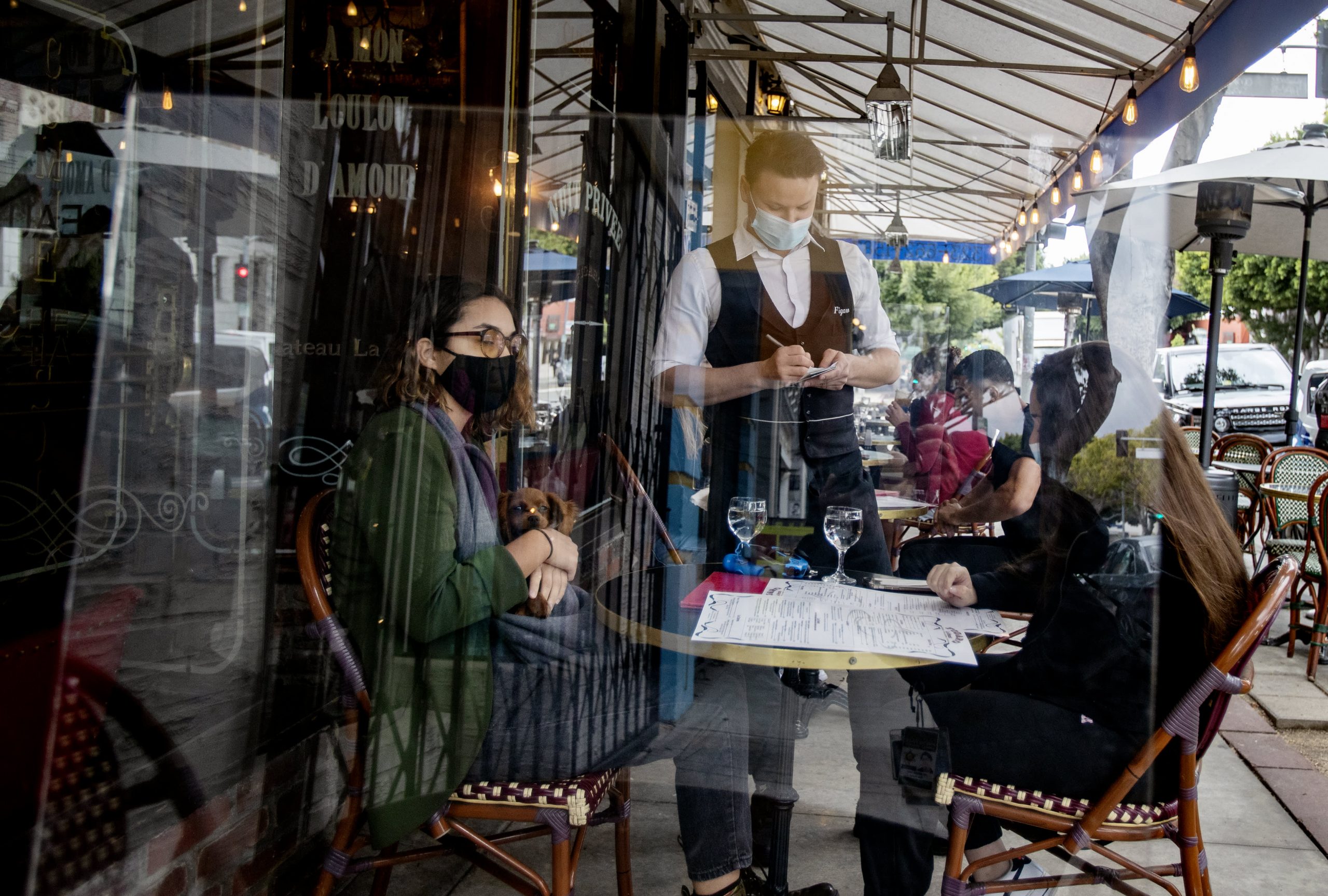 Waiter Boris Macquin serves customers behind plexiglass at Figaro Bistro on the first day Los Angeles County has allowed indoor seating since the coronavirus pandemic on March 15, 2021 in Los Angeles, California.