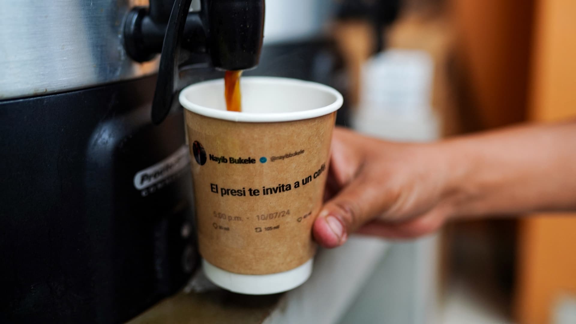 A coffee cup with a printed message from Salvadoran President Nayib Bukele's X account is pictured at Franco's Pupusa restaurant in San Salvador on July 17, 2024.