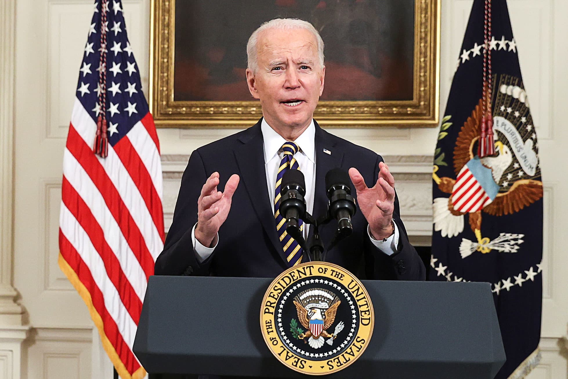 United States President Joe Biden holds a statement before signing an ordinance to remedy a global shortage of semiconductor chips in the State Dining Room of the White House in Washington on February 24, 2021.