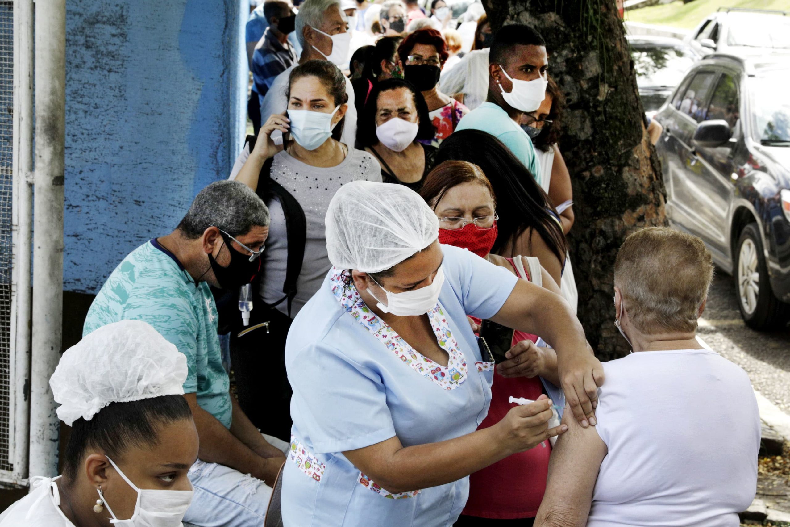 A health worker applies a Sinovac CoronaVac Coronavirus Disease (COVID-19) vaccine to an elderly Citzen on February 18, 2021 in Sao Goncalo, near Rio de Janeiro, Brazil.