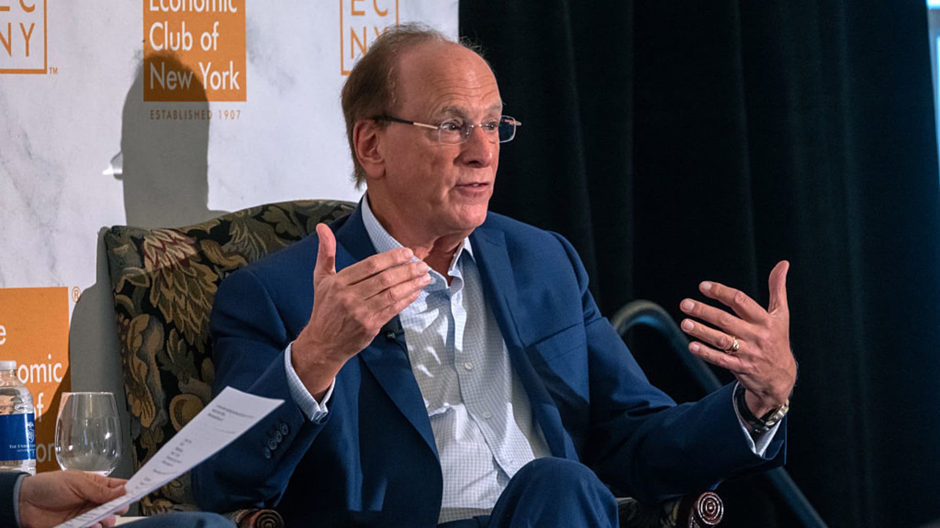 Larry Fink, CEO from Blackrock, speaks on April 7, 2025 in New York City in the Economic Club of New York.