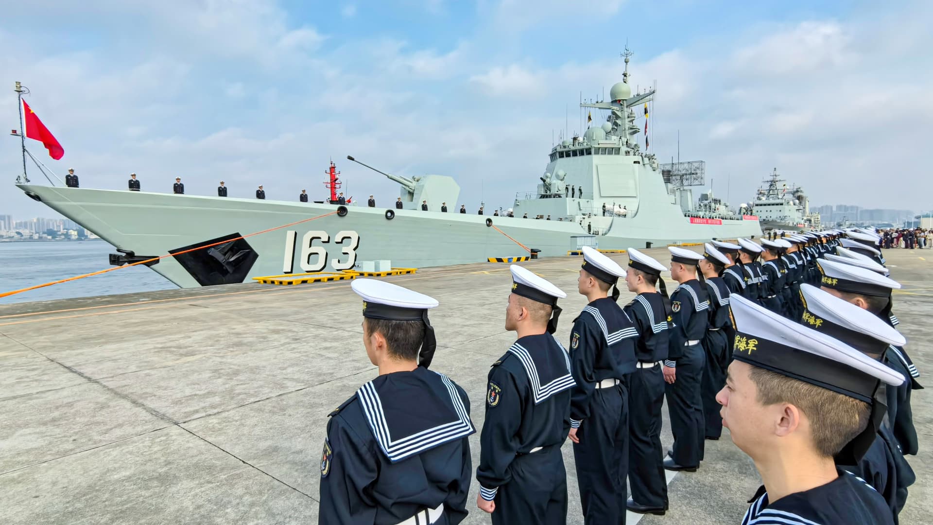 The 46th fleet of the Chinese Navy of the Liberation Army sets on February 21, 2024 by a military port in Zhanjiang, the province of Guangdong in southern China.