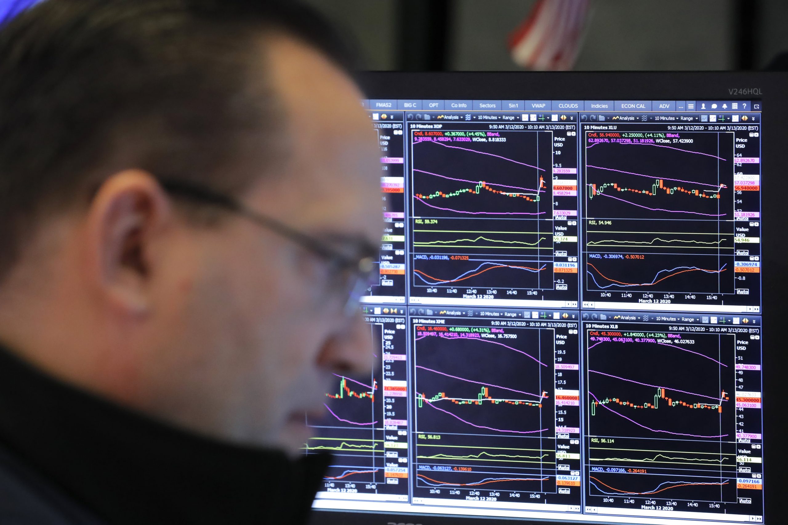 A trader works on the floor of the New York Stock Exchange (NYSE) after the opening bell of the trading session on March 13, 2020 in New York, USA.
