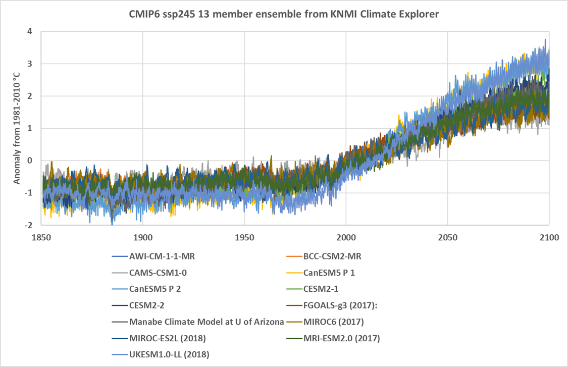 All curves are global mean temperature anomalies from the 1981-2010 mean temperature. Note that the dispersion of the results in the 19th century is more than one degree C. The current spread of the results isn’t much narrower, and the spread around 2100 is over two degrees. All of these model runs use the emissions scenario ssp245 which, as far as I can tell, is the CMIP6 version of RCP 4.5. So it is the middle scenario.