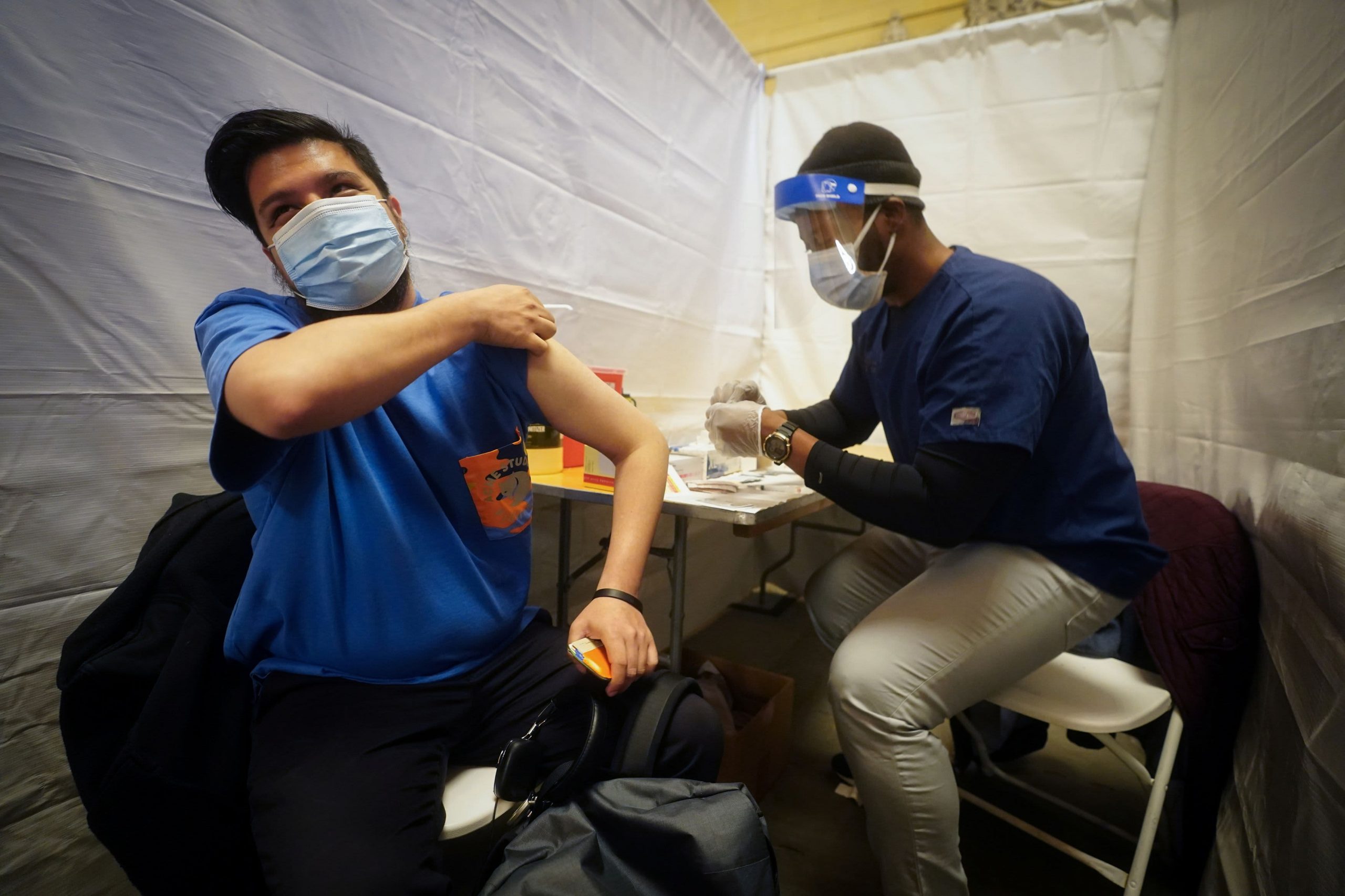 A commuter rolls up his sleeve to get a coronavirus disease (COVID-19) vaccination shot at the Grand Central Station Terminal train station in Manhattan on May 12, 2021 in New York City, New York, United States.