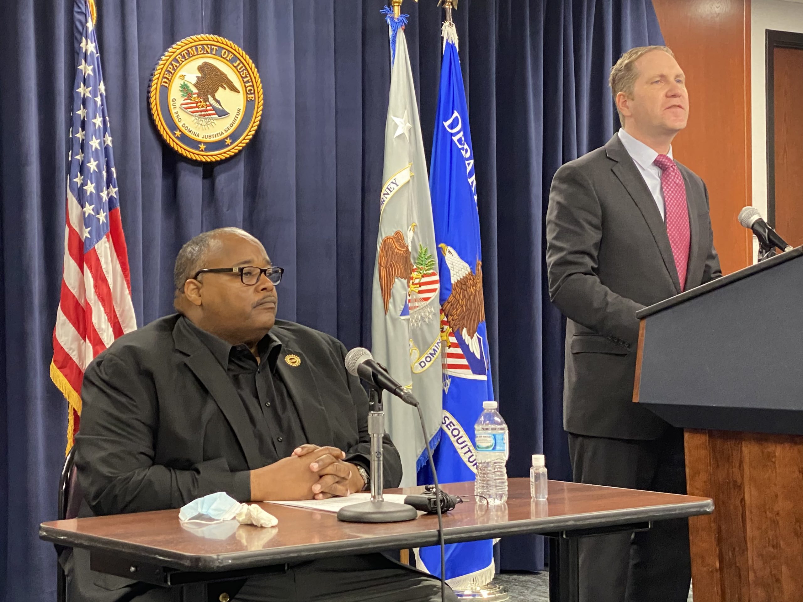 UAW President Rory Gamble (left) and US attorney Matthew Schneider announce a settlement agreement in Detroit on December 14, 2020 to end a year-long corruption investigation into the union.