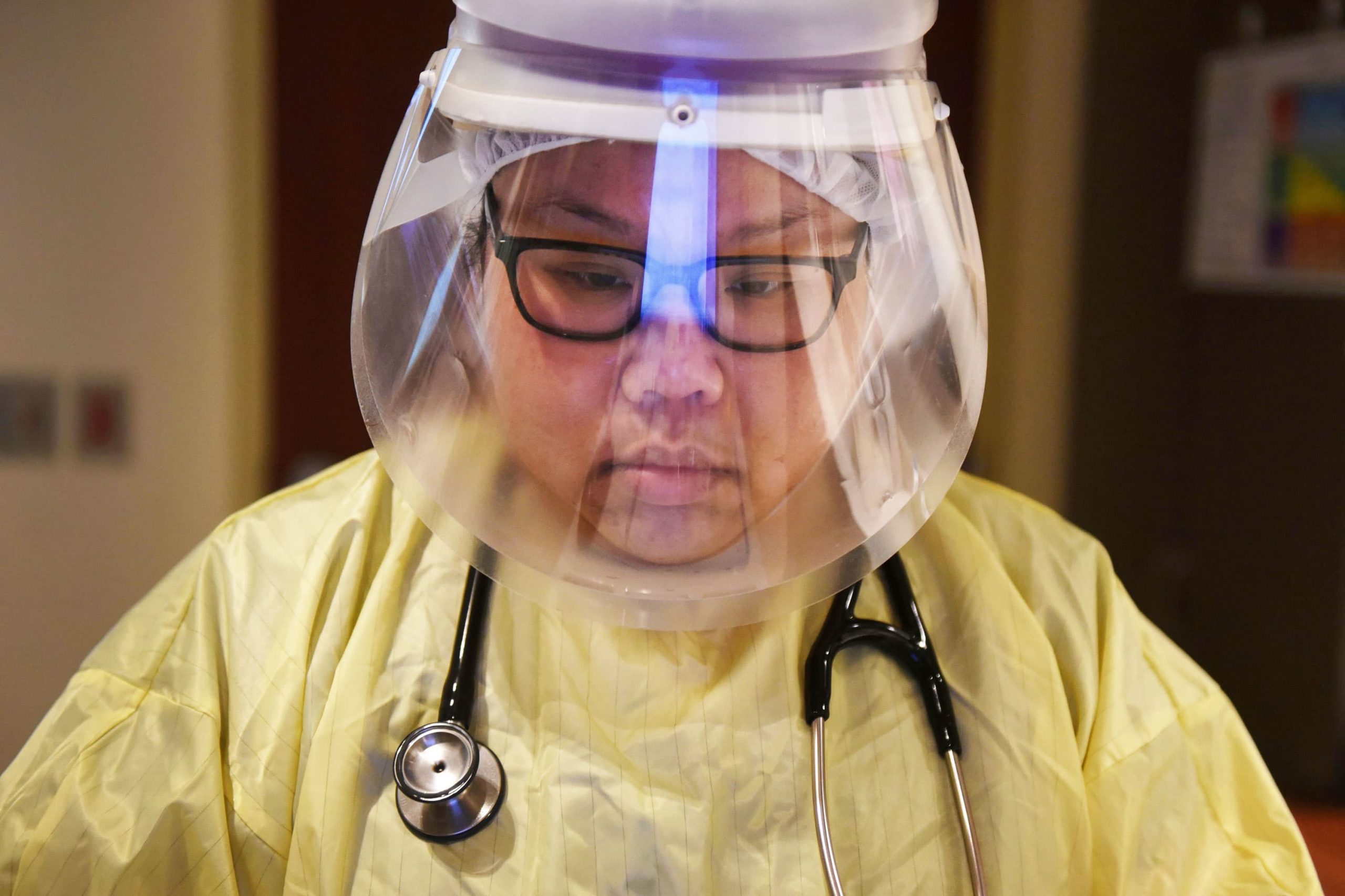 Teresa Nguyen, a respiratory therapist, reviews patient records in a room for people with coronavirus disease (COVID-19) at a hospital in Hutchinson, Kansas on November 20, 2020.