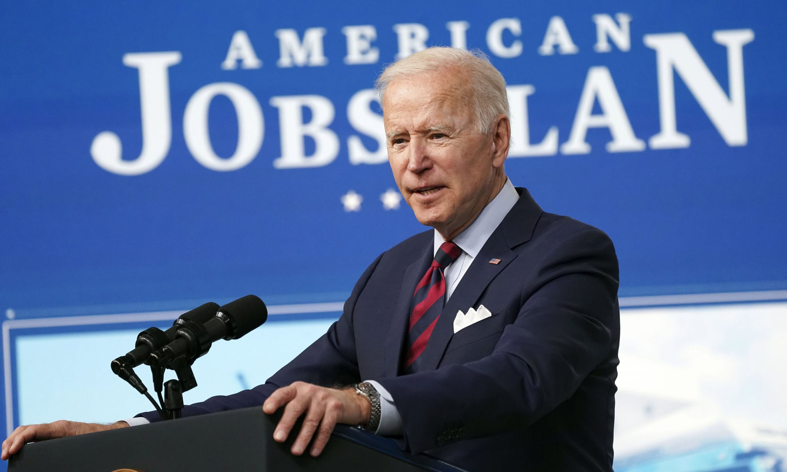President Joe Biden speaks at the Eisenhower Executive Office Building in Washington, DC on Wednesday, April 7, 2021.