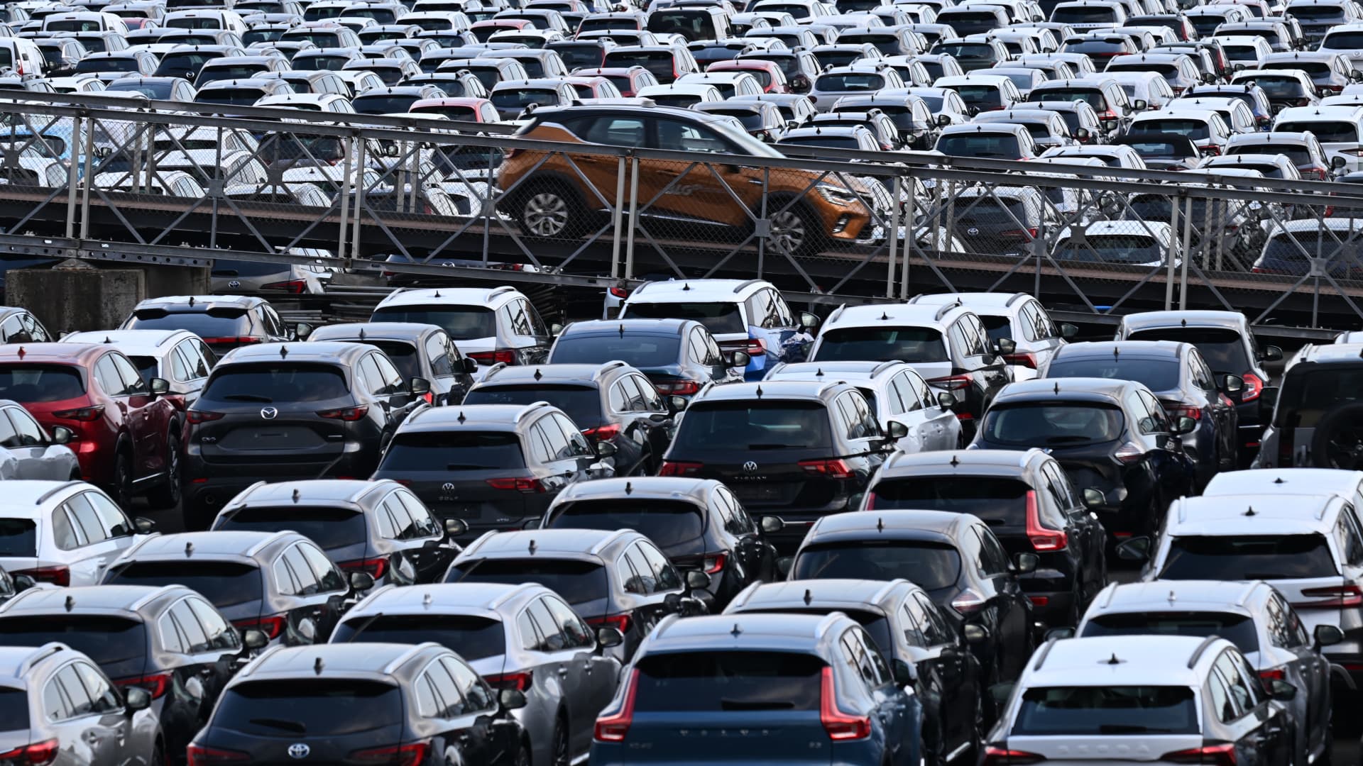 On August 7, 2024, new cars of various brands will be parked for export in the parking lot of a car terminal in the port of Duisburg.