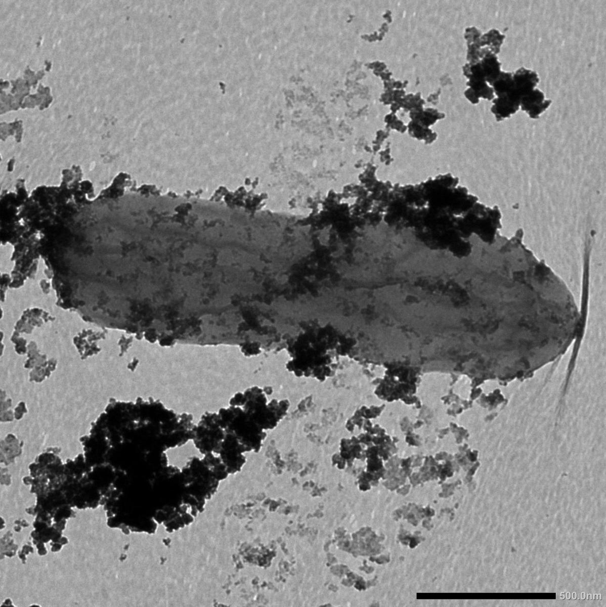 PICTURE: THIS GEOBACTER CELL, WHICH LOOKS A BIT LIKE A GRAY PEANUT IN THIS MICROSCOPE IMAGE, IS SPOKEN WITH A DARK COATING OF COBALT MINERALS THAT WOULD BE TOXIC … View more CREDIT: HUNTER DULAY, MS