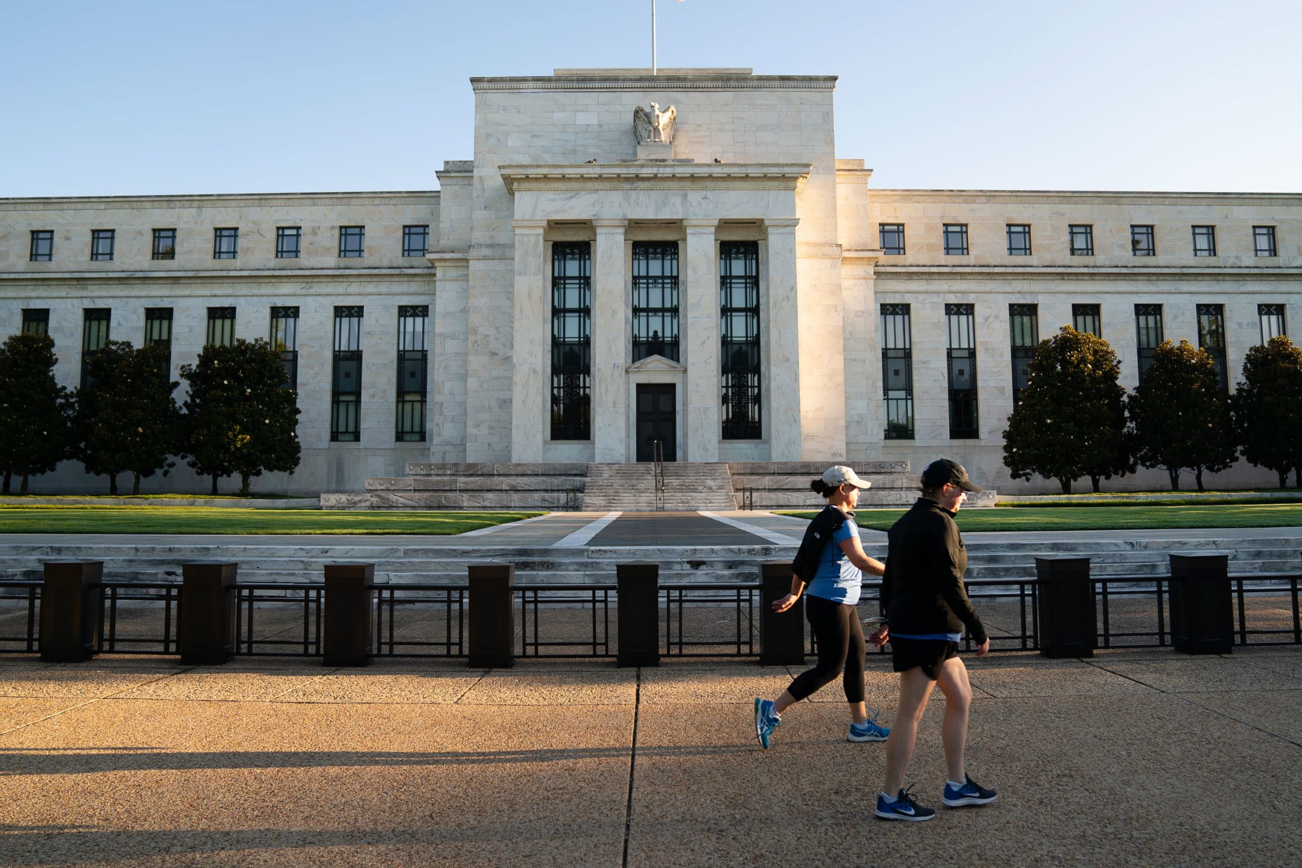 Joggers pass the Marriner S. Eccles Federal Reserve building in Washington, DC on Tuesday, August 18, 2020.