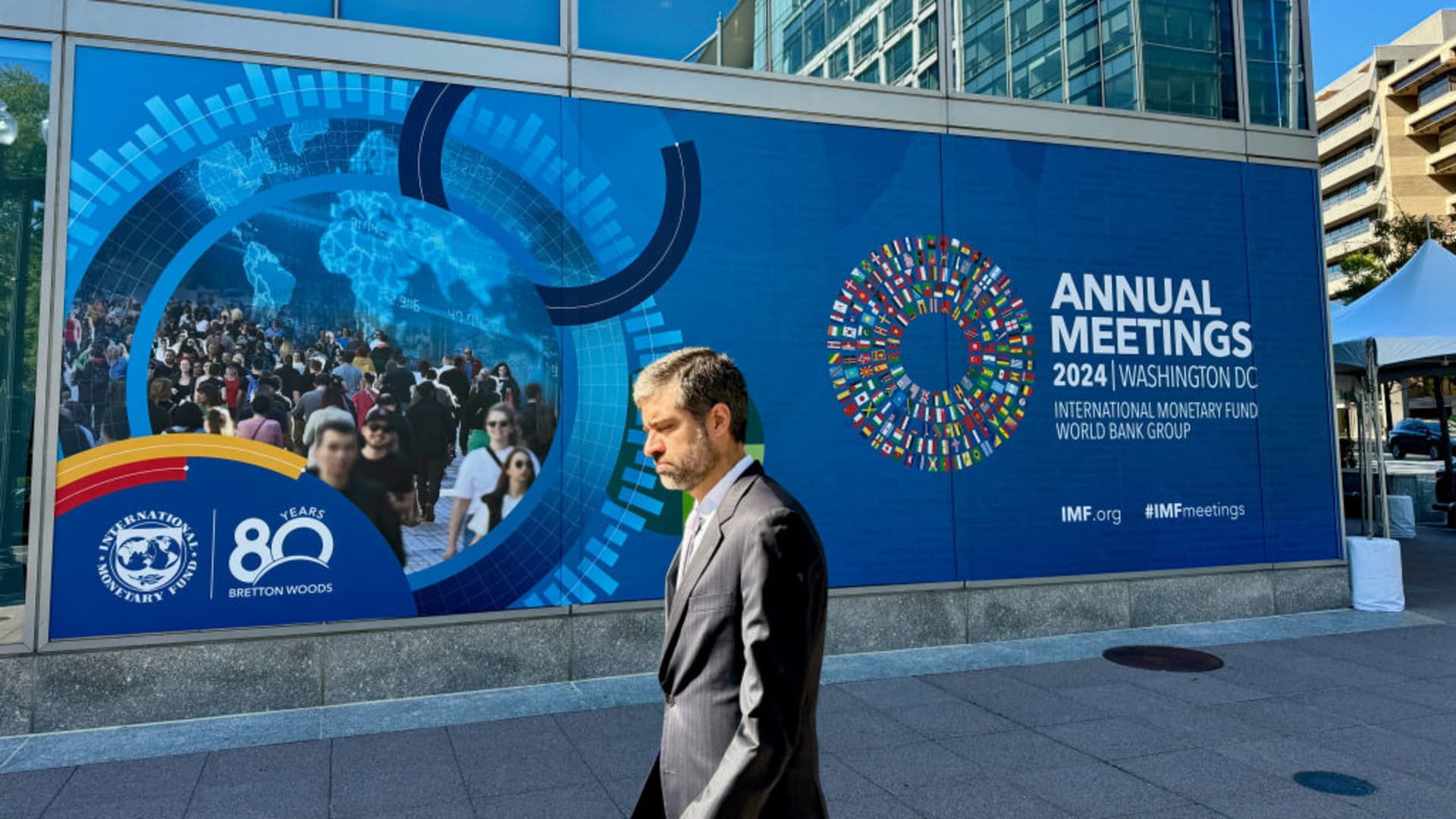 A man walks past signage for the 2024 IMF-World Bank Annual Meetings in front of the International Monetary Fund headquarters in Washington, DC on October 18, 2024.