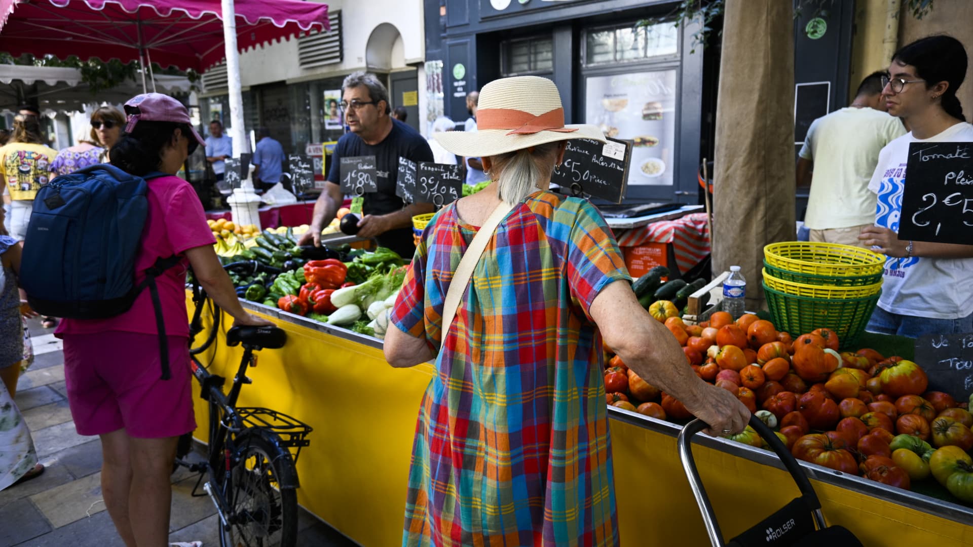 People shopping at the Cour Lafayette downtown market in Toulon on July 27, 2024.