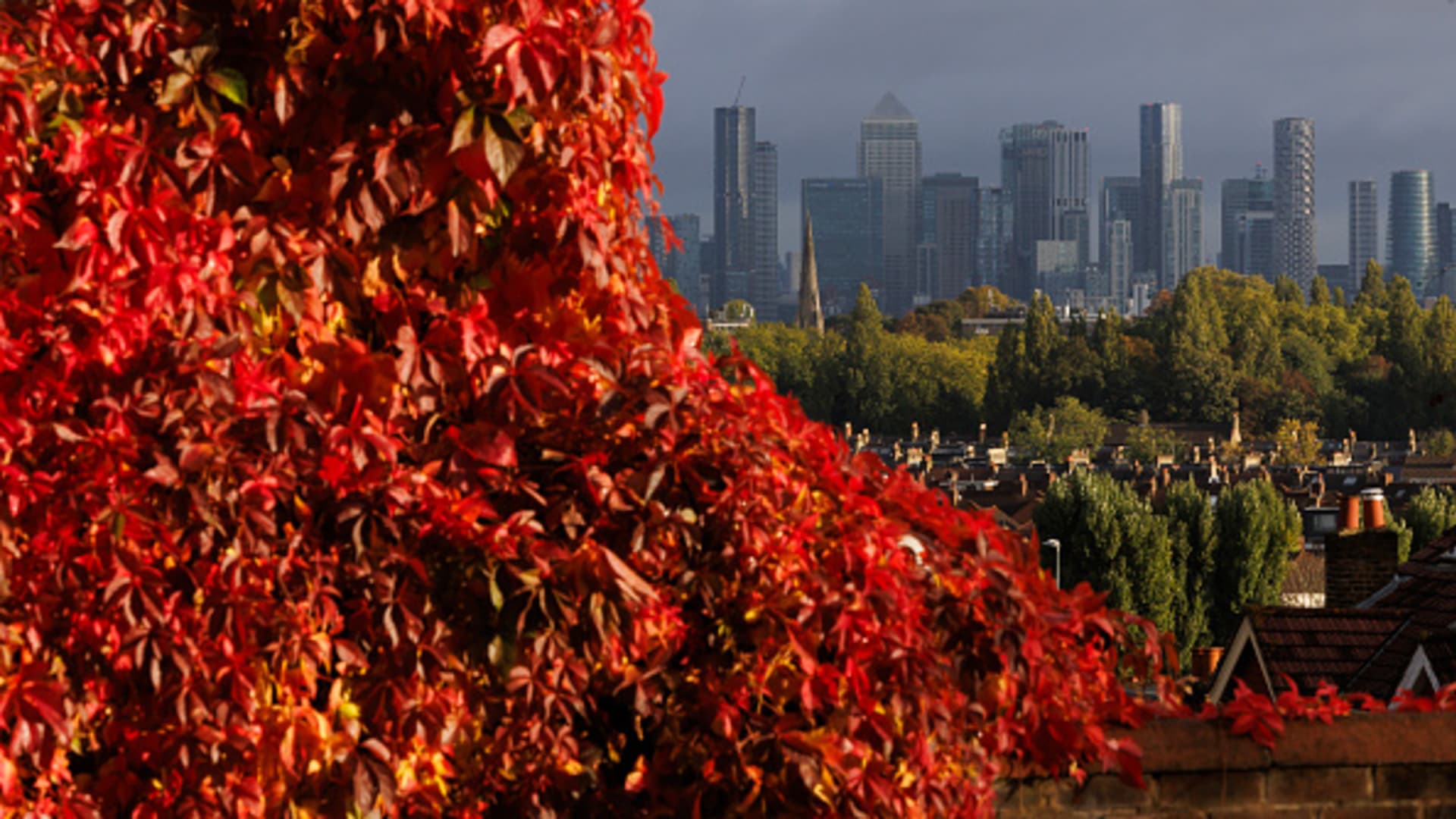 The Canary Wharf business district is seen in the distance behind autumn leaves on October 09, 2024 in London, United Kingdom.