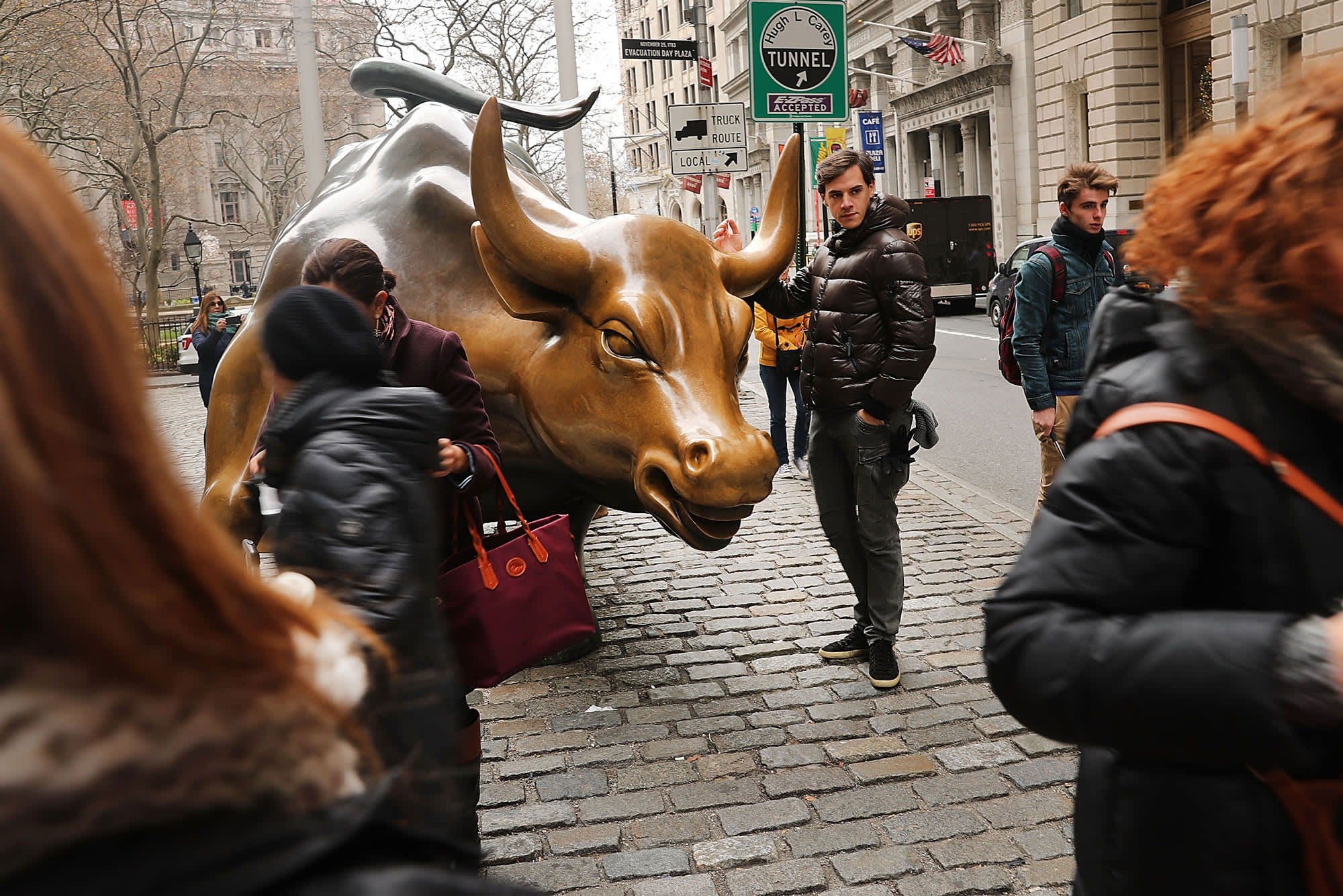 Tourists take a photo with the bull near the New York Stock Exchange.