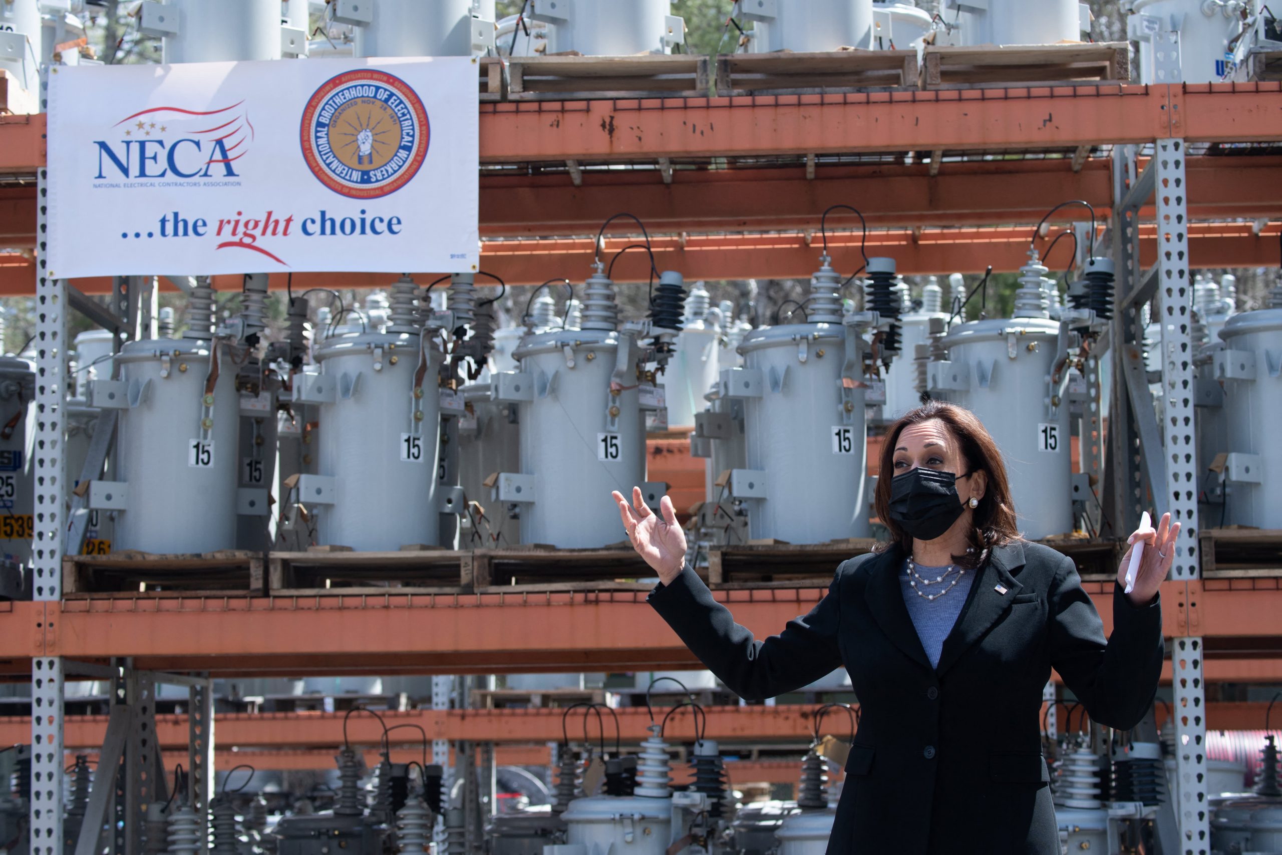 Vice President Kamala Harris speaks during a listening session on broadband internet at the New Hampshire Electric Co-op in Plymouth, New Hampshire, April 23, 2021 as she travels to the state to promote government economic plans.