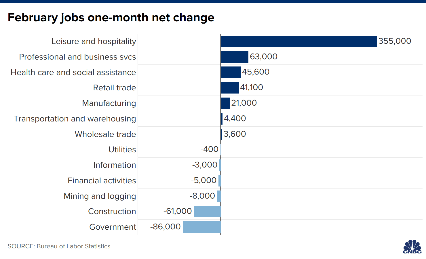 CNBC examined the net changes in industry for February jobs based on the data included in the employment report.
