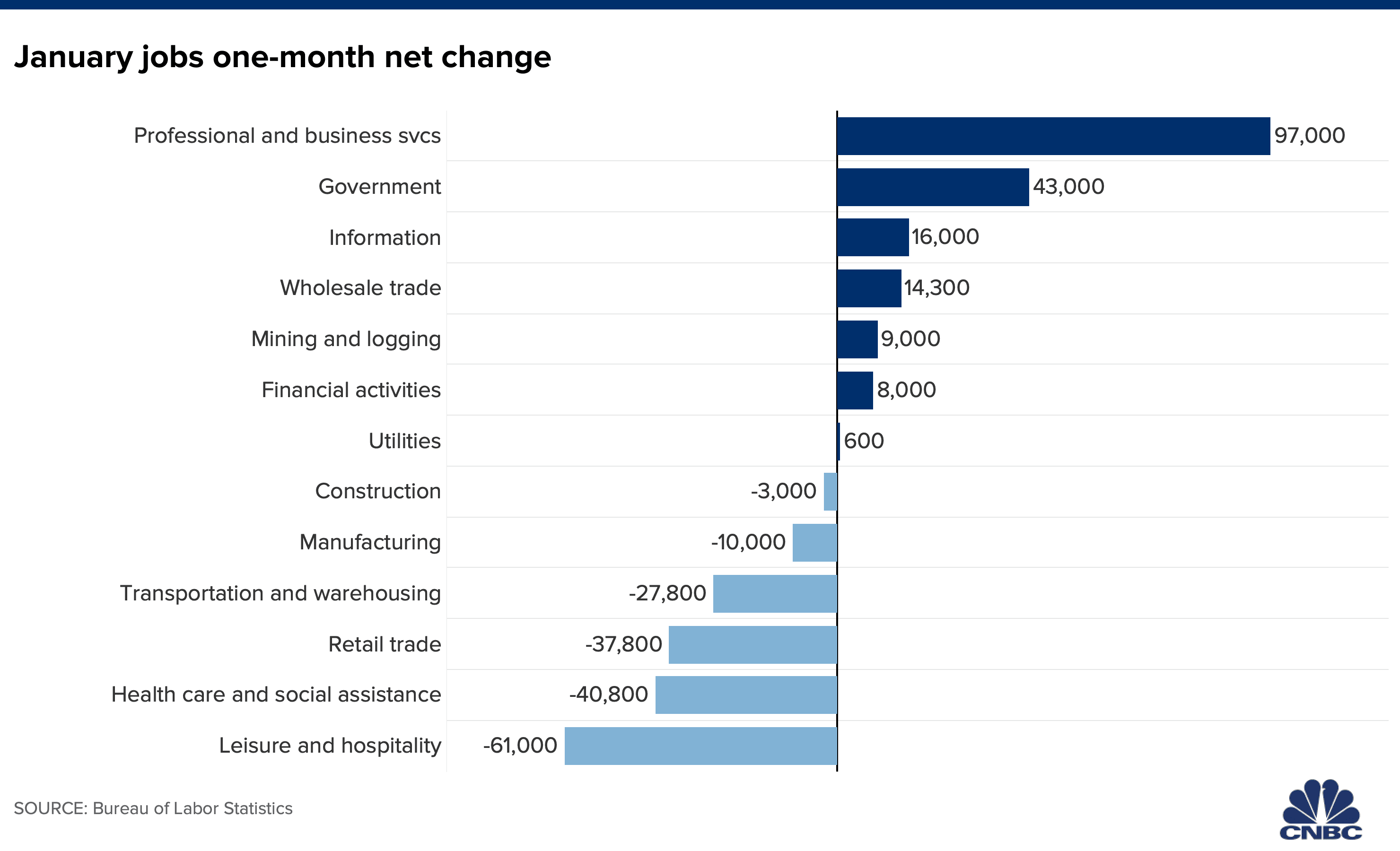 CNBC examined the net industry change for jobs in January based on the data included in the Employment Report.