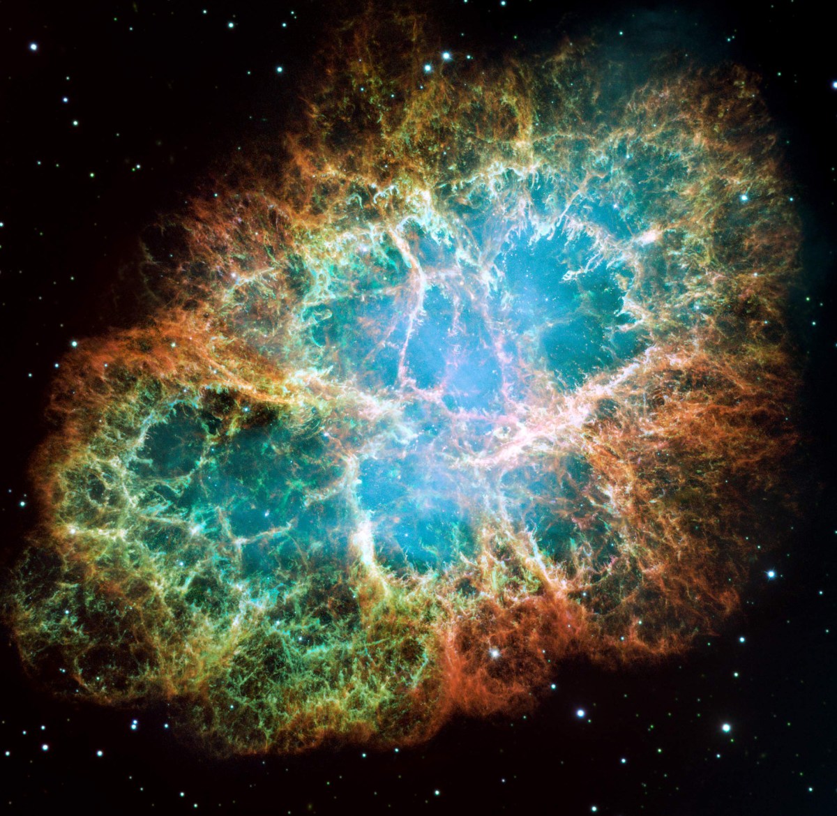 Banner: The Crab Nebula, the six light-years long cloud of debris from a supernova explosion, houses a neutron star that rotates 30 times per second and is one of the brightest pulsars in the sky in terms of X-ray and radio wavelengths. This compilation of Hubble Space Telescope images shows various gases emitted in the explosion: blue indicates neutral oxygen, green indicates singly ionized sulfur, and red indicates doubly ionized oxygen. Recognition: NASA, ESA, J. Hester and A. Loll (Arizona State University)