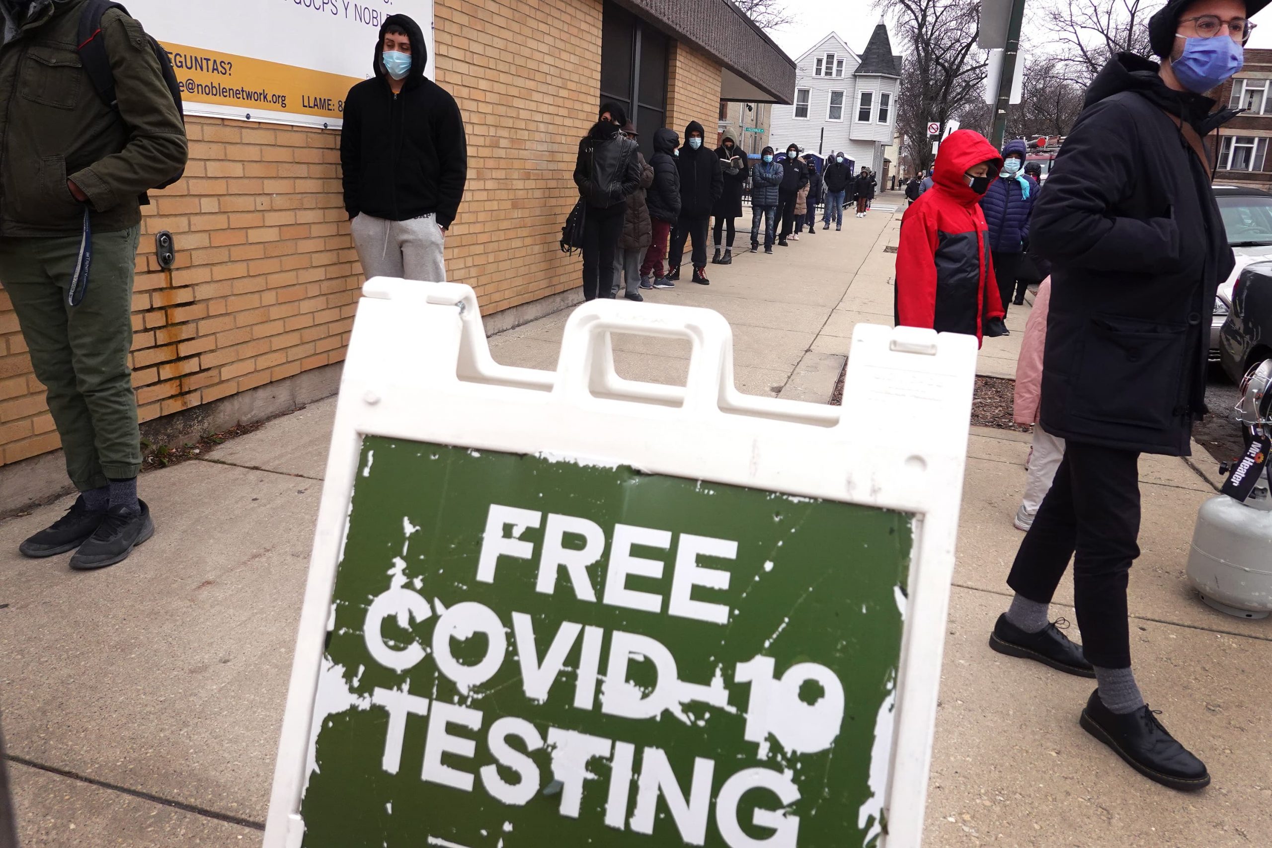 Residents line up for COVID-19 testing at Pritzker College Prep High School in the Hermosa neighborhood on November 30, 2020 in Chicago, Illinois.