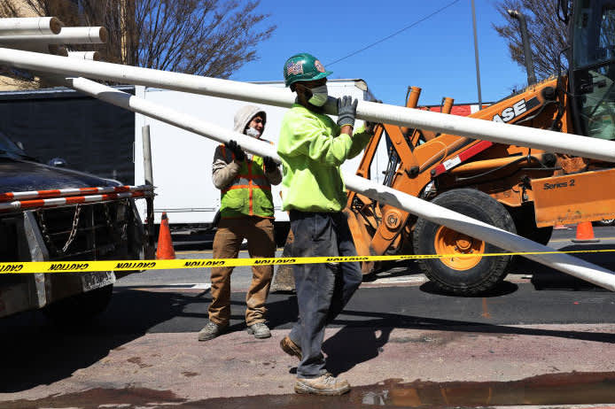 Construction workers perform infrastructure repairs at the intersection of Church Avenue and Coney Island Avenues in the Flatbush neighborhood of Brooklyn on April 6, 2021 in New York City.