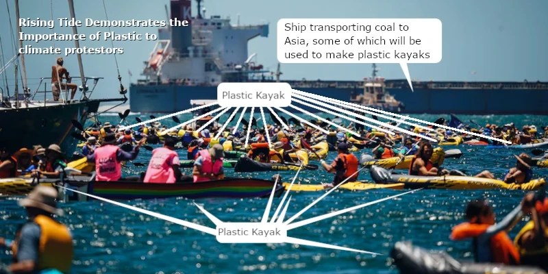 If you look closely at the picture above, you'll be hard-pressed to find anything that isn't made of plastic, except for the ship that transports the coal. Their life jackets are plastic, their oars are plastic, their kayaks are plastic, their t-shirts are mostly plastic, and if we could see them we would probably discover that what they were wearing on their feet, probably made of plastic is plastic.