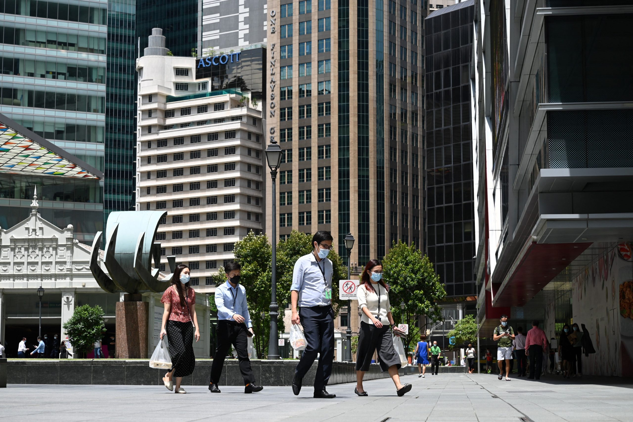 People take their lunch break in the Raffles Place financial district in Singapore on May 5, 2021.