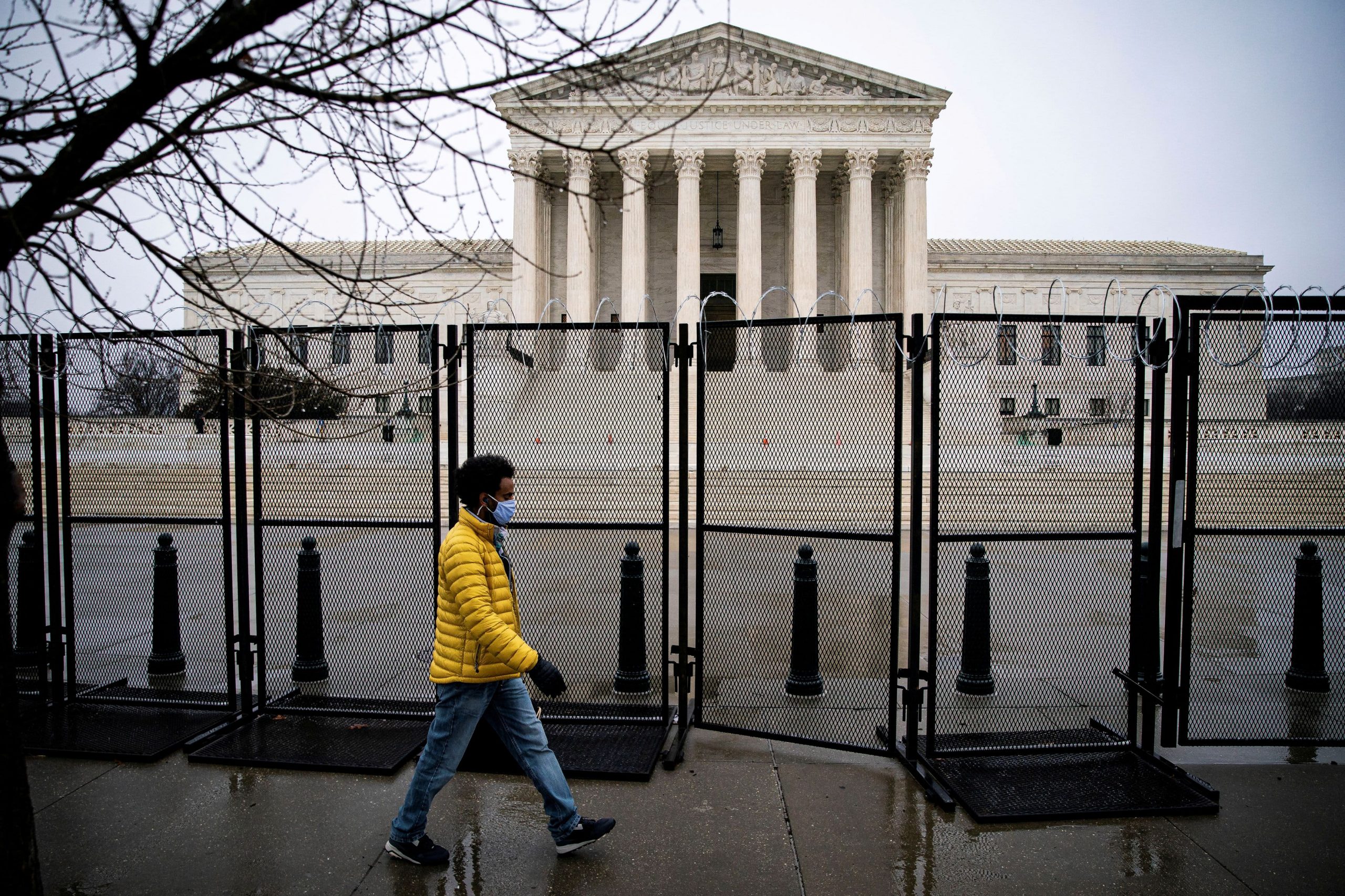 A man walks past the barbed wire and security fences that surround the U.S. Supreme Court in Washington on January 26, 2021.