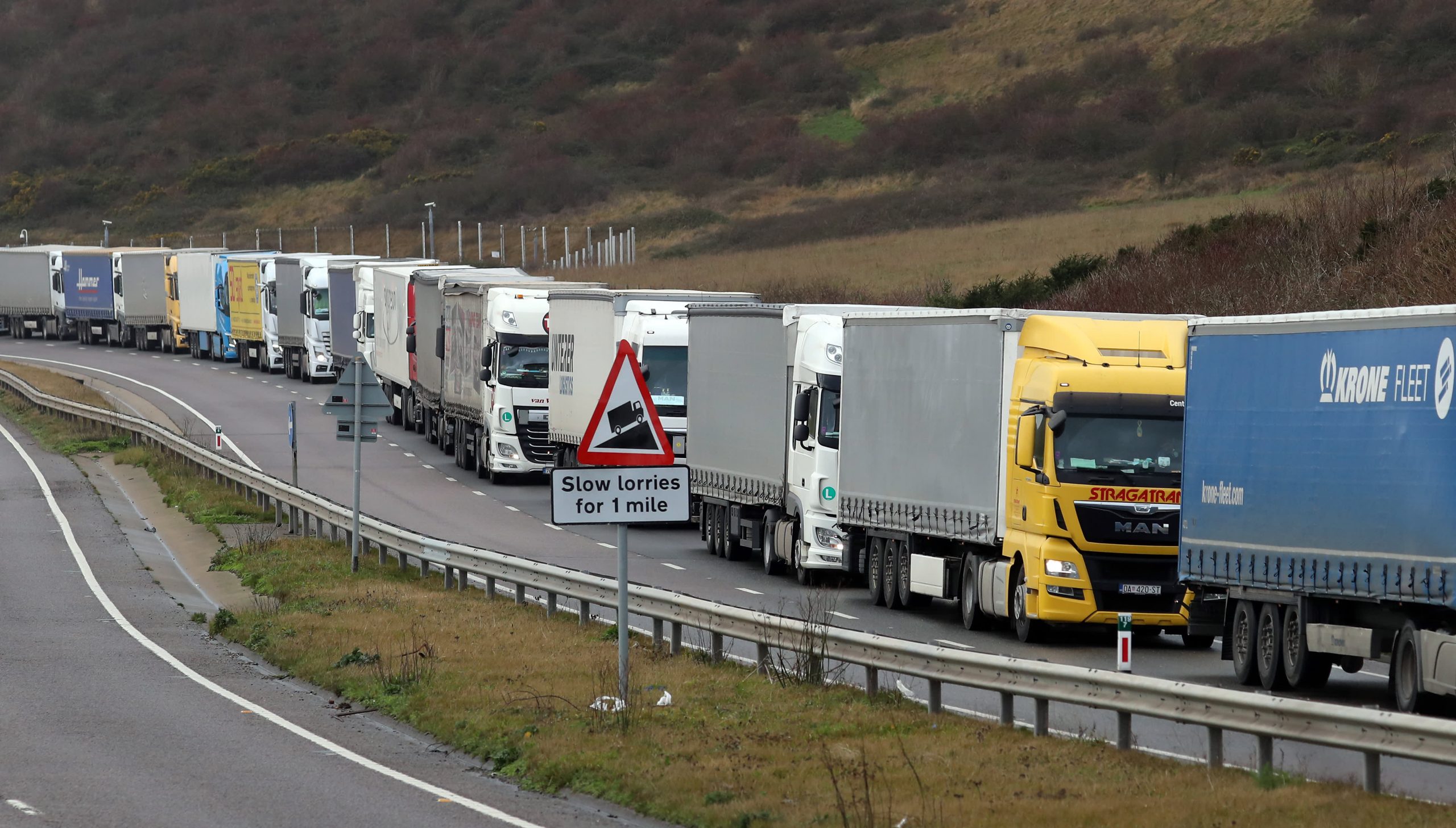 Trucks line up on the A20 to reach the port of Dover in Kent.