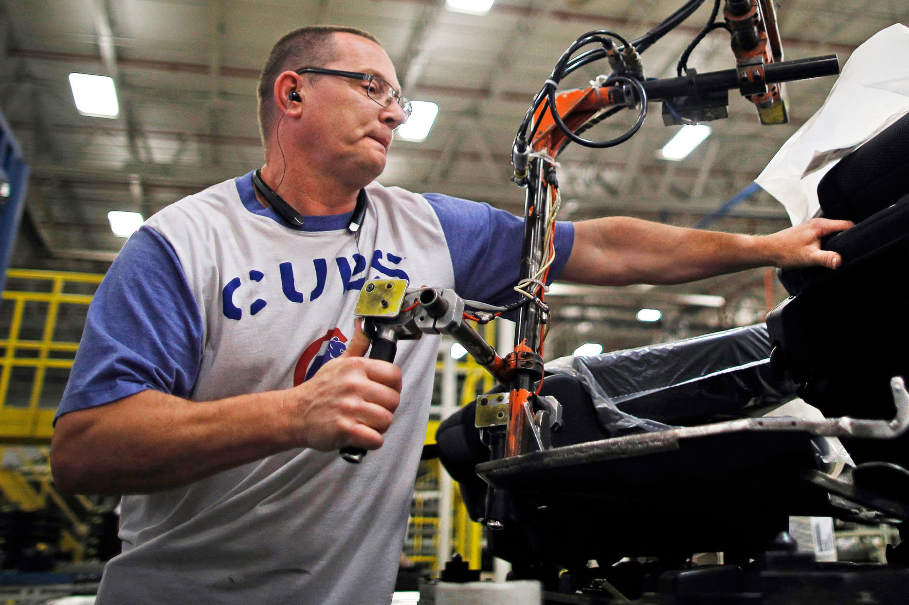 A worker uses a hoist to assemble a car seat at the Lear Corp production facility. in Hammond, Indiana.
