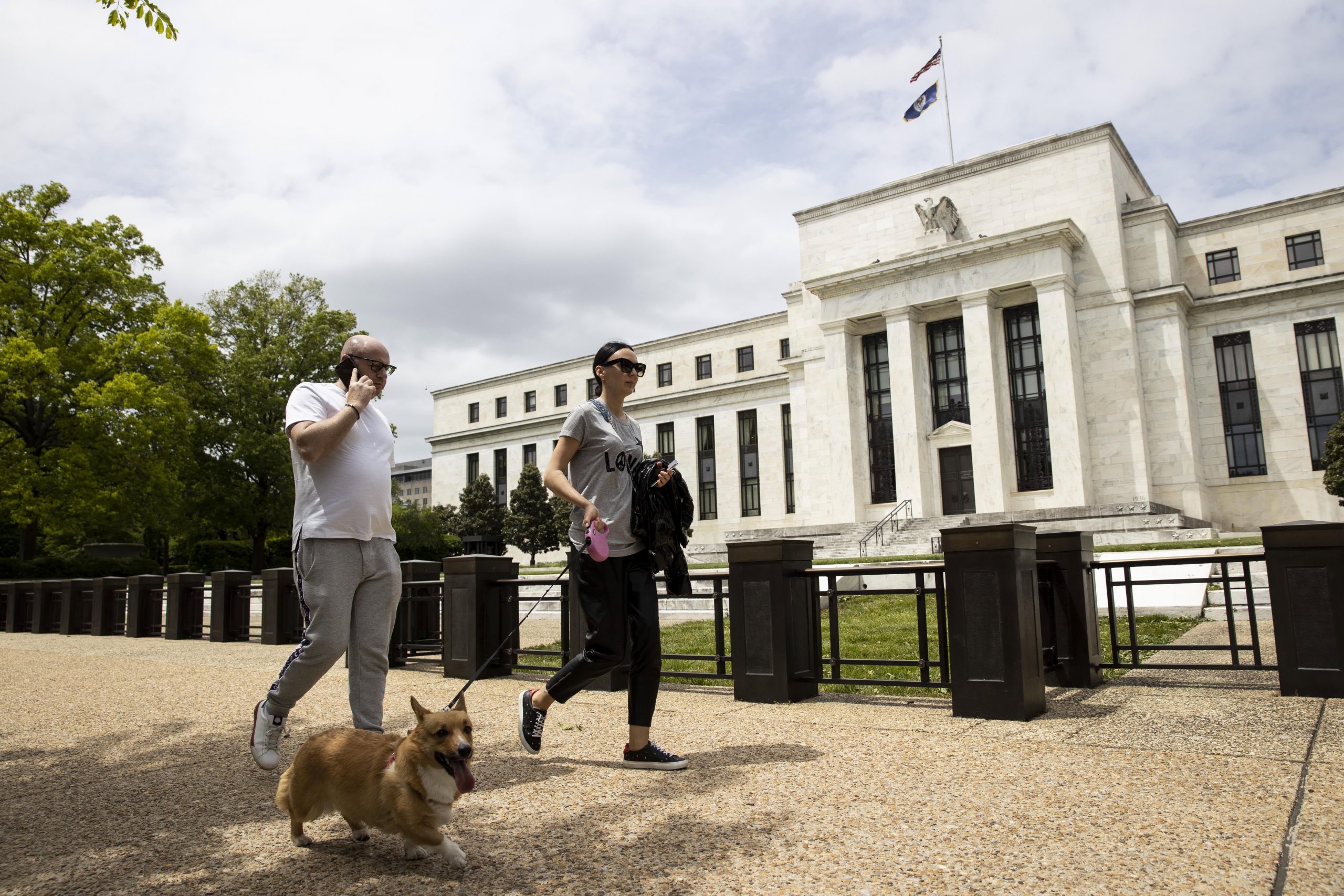 People walk past the Federal Reserve building in Washington DC, the United States, on May 21, 2020.