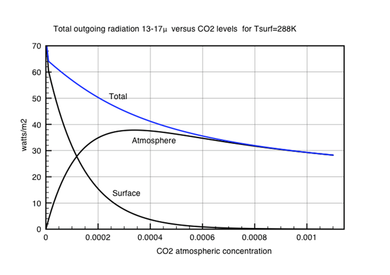 There is a transparent window to space at wavelengths approximately between 9 to 16 microns. Long wave radiation in this wavelength range generally passes unrestricted to space through this window. The introduction of CO2 to the atmosphere restricts radiative flow centred around 15 microns. It closes this window slightly. This warms the planet, as shown in Figure 1 but loses all potency by the time CO2 concentrations reach about 600 ppm.