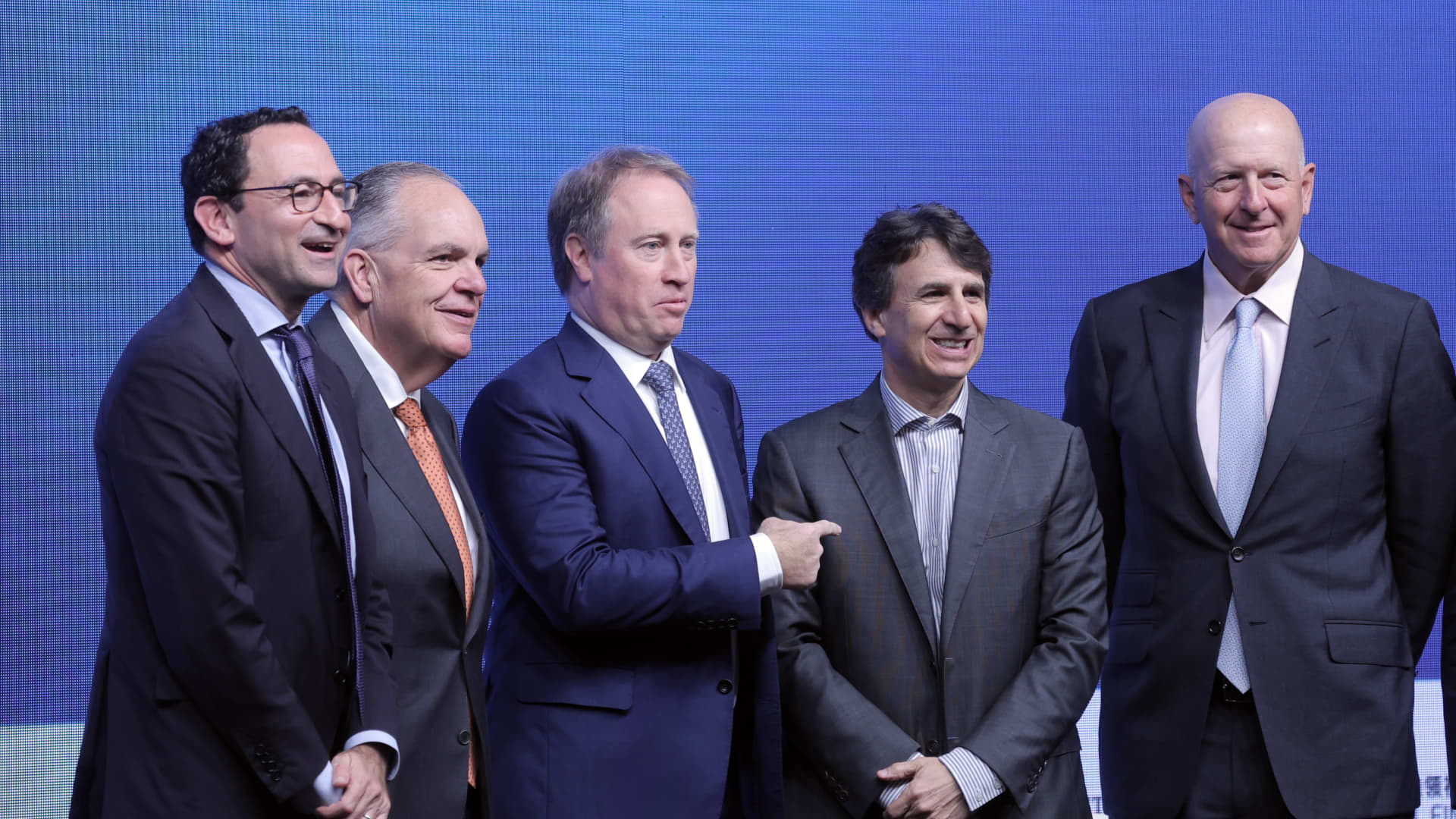 Jonathan Gray, president and chief operating officer of Blackstone Inc., from left, Ron O'Hanley, chief executive officer of State Street Corp., Ted Pick, chief executive officer of Morgan Stanley, Marc Rowan, chief executive officer of Apollo Global Management LLC and David Solomon, CEO of Goldman Sachs Group Inc., during the Global Financial Leaders' Investment Summit in Hong Kong, China, on Tuesday, November 19, 2024.