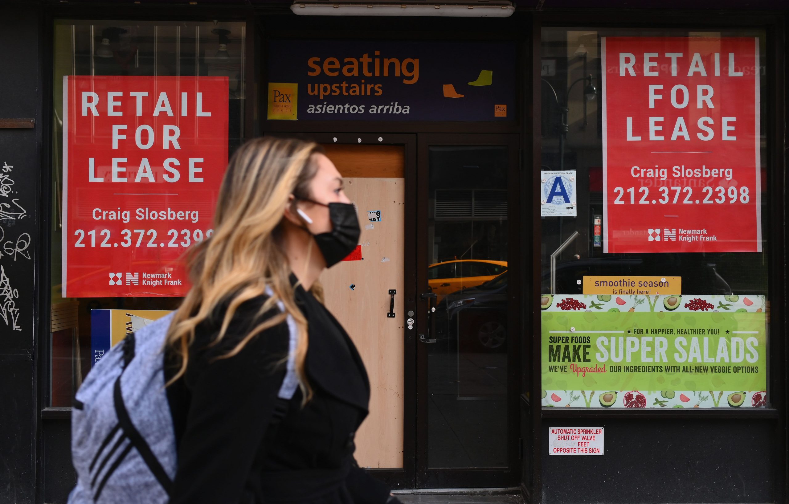 A woman walks past a closed retail store for rent in downtown Manhattan on January 25, 2021 in New York City.