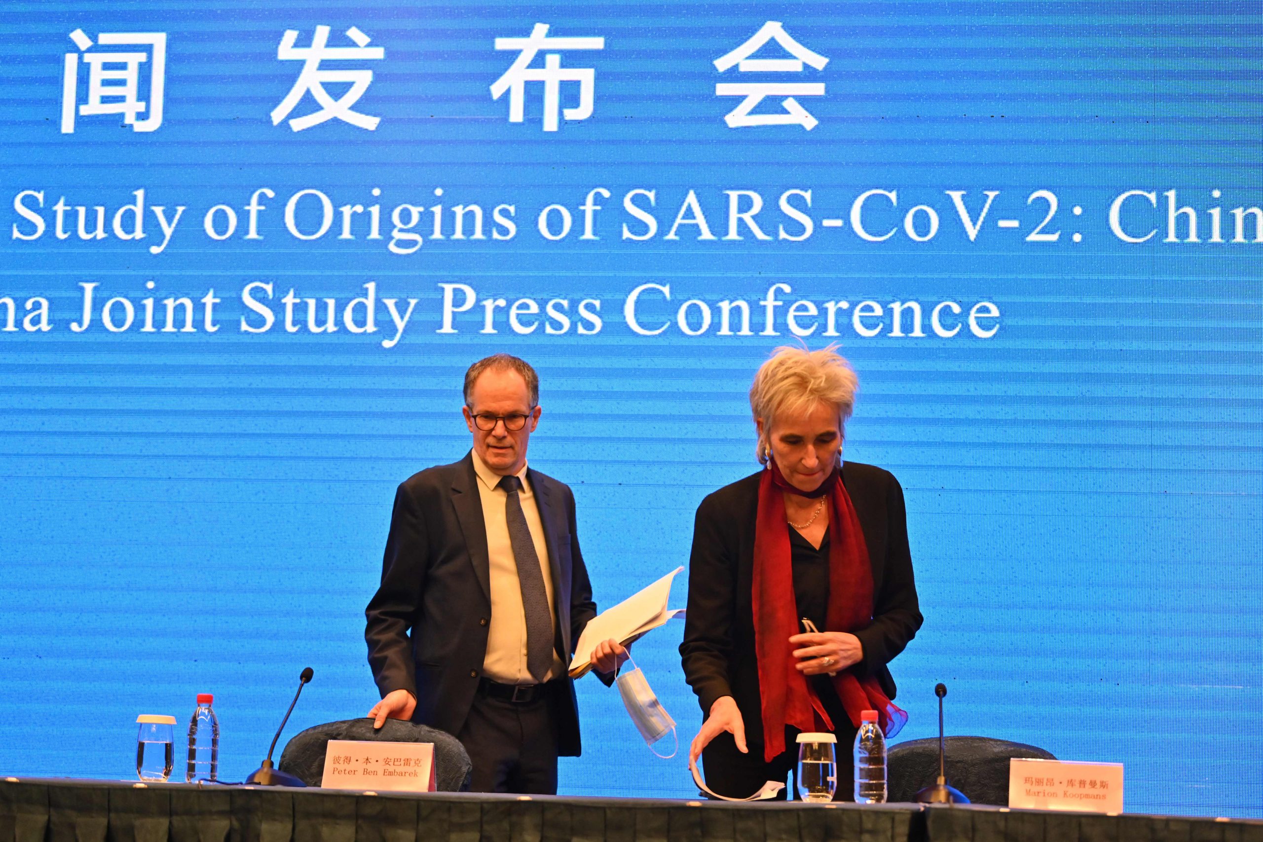 Peter Ben Embarek and Marion Koopmans (R) come to a press conference on February 9, 2021 to conclude a visit by an international team of experts from the World Health Organization (WHO) to the city of Wuhan in the Chinese province of Hefei.