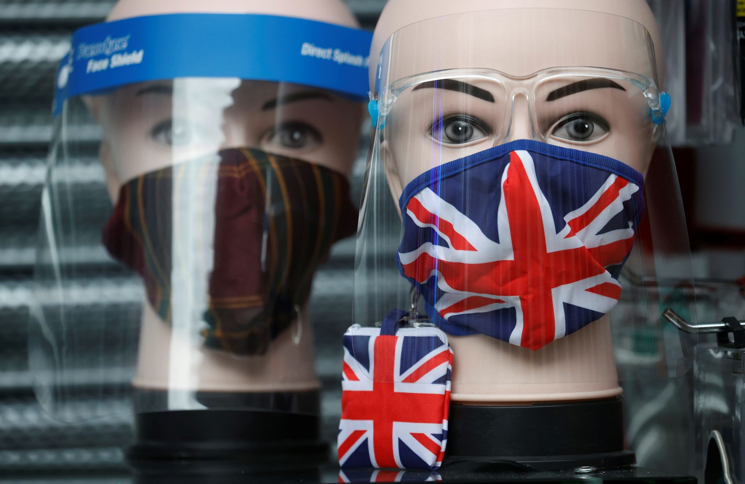 A Union Jack face mask is seen for sale in the window of a shop during the coronavirus disease (COVID-19) outbreak in Manchester, United Kingdom, on December 26, 2020.