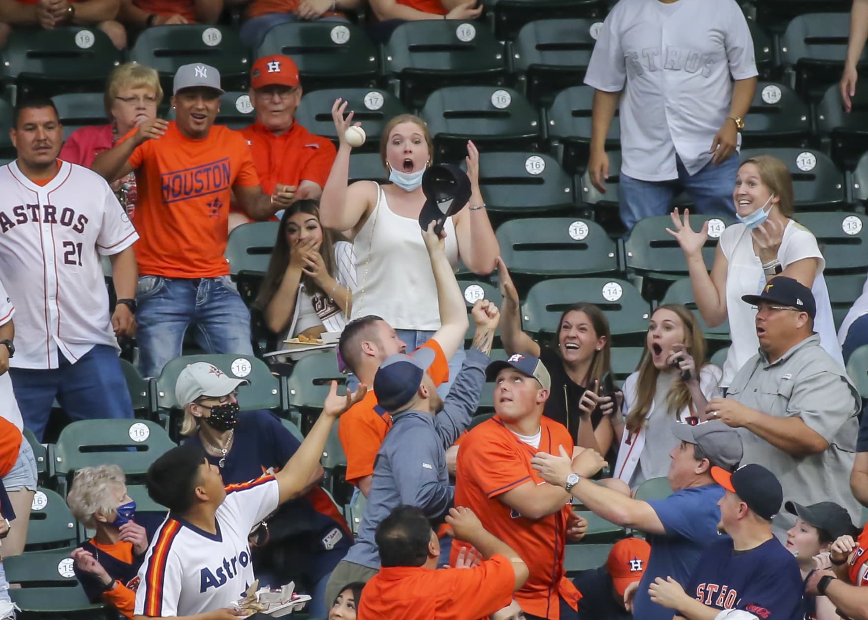 Houston Astros fans will reach home run outfield player Willie Calhoun, 5, hit by Texas Rangers in the first inning of the baseball game between the Texas Rangers and the Houston Astros, Texas on May 13, 2021 at Minute Maid Park in Houston.