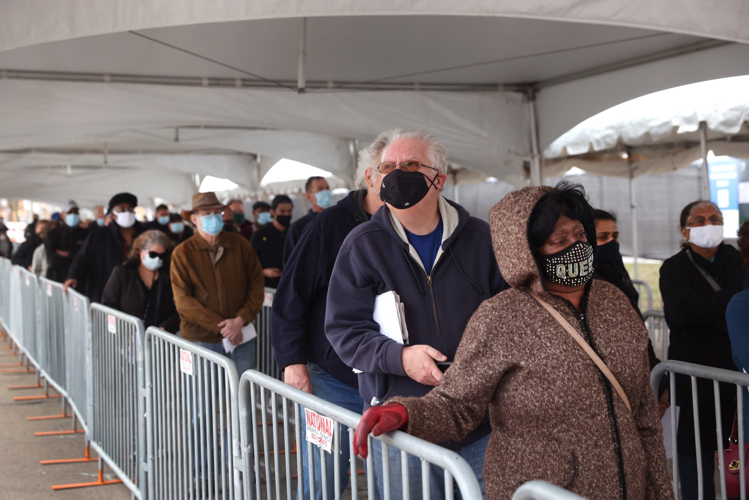 Residents wait in line to be vaccinated on March 10, 2021 in Chicago, Illinois at a COVID-19 mass vaccination center set up in a parking lot outside the United Center, home of the Chicago Bulls and Blackhawks.