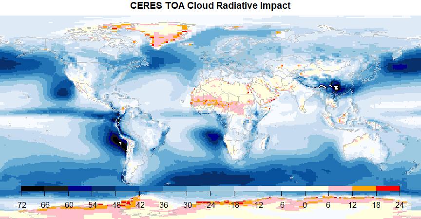 Die maximale Wolkenkühlung oder die negativsten CRE-Werte liegen in den kleinen weißen Flecken in der Mitte der schwarzen Flecken vor Südperu und im Südosten Chinas nördlich von Vietnam. Diese CRE-Werte sind sehr negativ (extrem kühlend) und nicht maßstabsgetreu. Abbildung 1 korreliert ziemlich gut mit der Wolkenfraktion in Abbildung 2 oder den helleren Farben in Abbildung 3 mit Ausnahme der polaren Eiskappen.