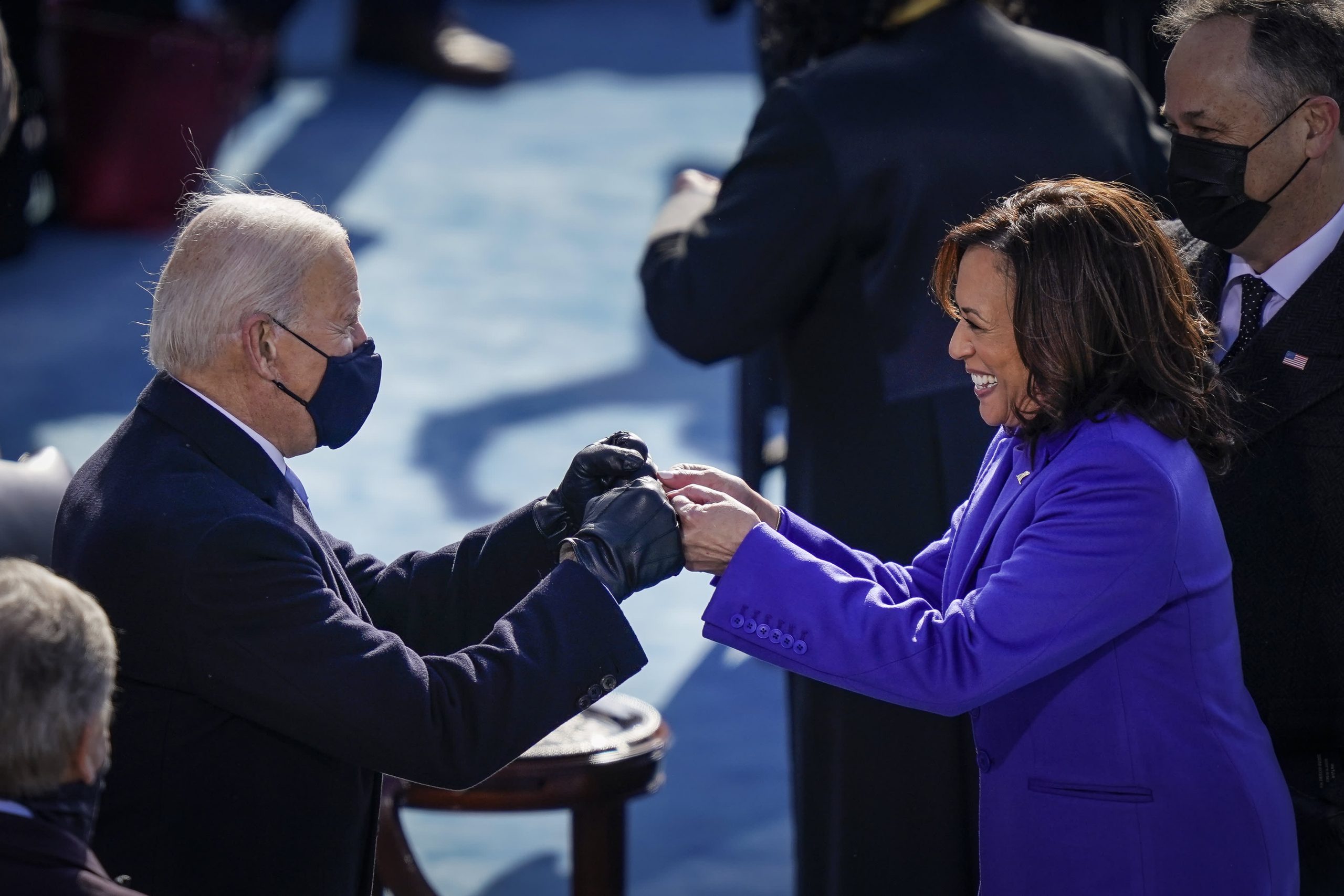 US President Joe Biden touts Vice President Kamala Harris with her fist after taking the oath of office on the Western Front of the US Capitol on January 20, 2021 in Washington, DC.